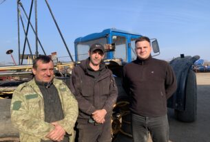 Усяго ж на падкормцы азімай пшаніцы было задзейнічана 4 адзінкі тэхнікі. А.Д.Спірыдзёнак прывозіць “Дзвіну” да месца працы на трактары са спецыяльным лафетам. Вадкае ўгнаенне да “Дзвіны” падвозяць бацька з сынам Віктар і Аляксандр Буйніцкія. 600 літраў КАСа А.Д.Спірыдзёнку хапала якраз на два праезды па вялікіх старасельскіх раўнінах участку ўздоўж трасы ПолацкМінск. У адрозненні ад сыпучых хімікатаў вадкай сумесі на полі не бачна, як і не заўважыш следу пасля праходу “Дзвіны”. Таму разлічваць схему руху дапамагае навігатар, на экране якога адлюстроўваюцца запрацаваныя палосы. Такім чынам эканоміцца і паліва, і дэфіцытнае ўгнаенне.