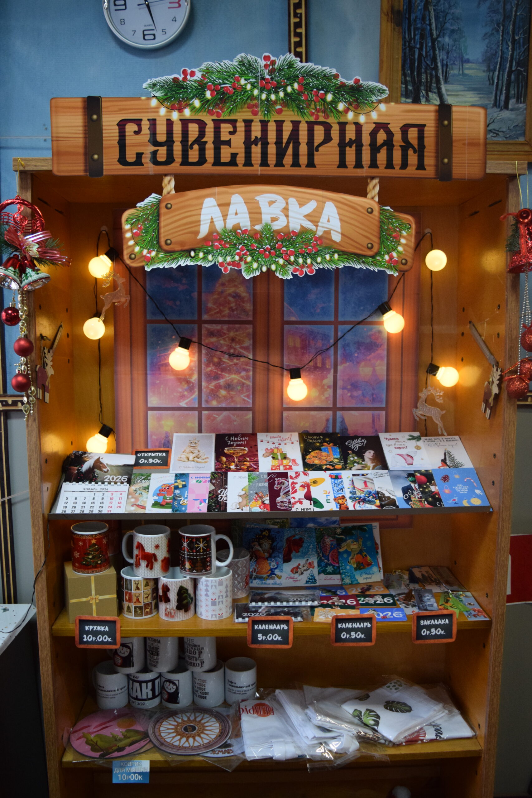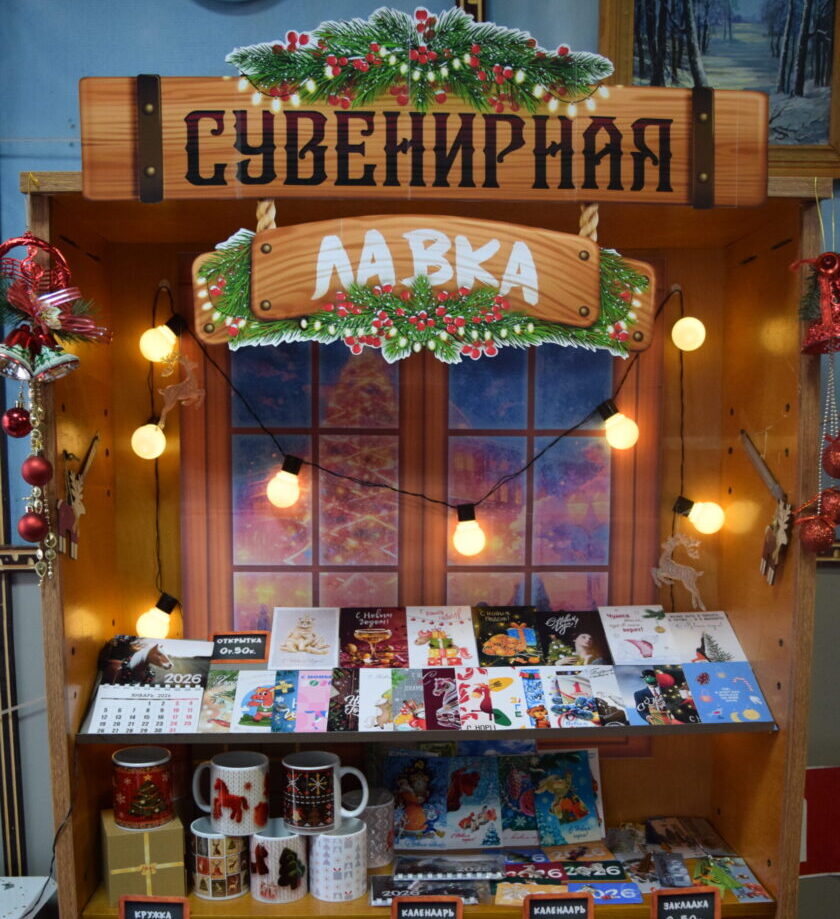 Акцэнт тут зроблены найперш на прэзентацыю вырабаў навагодняй тэматыкі: кружкі і закладкі для кніг са святочнымі выявамі, віншавальныя паштоўкі, календары на 2026 год – рознага памеру і кошту, з вялікімі лічбамі. У якасці падарунка можна набыць таксама шопер ці, скажам, дыванок для камп’ютарнай мышкі. Прымаюцца і заказы з індывідуальным дызайнам, пры гэтым практычна ўсё вырабляецца ў той жа дзень, максімум – на наступны.