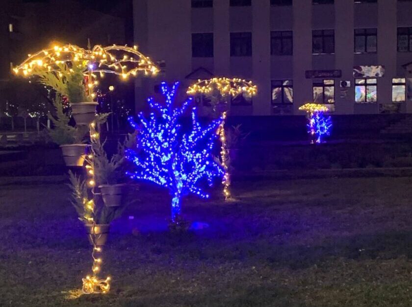Ушачане, напэўна, ужо ацанілі навагодні антураж цэнтральнай плошчы гарпасёлка, якая ва ўсю зіхаціць каляровымі агеньчыкамі. Сёлета яе ўбранства дапоўнілася новымі арт-аб’ектамі: над пешаходнымі пераходамі прыгожа пераліваюцца расцяжкі, а на кветніках ля будынка райвыканкама заззялі штучныя дрэўцы і парасоны.