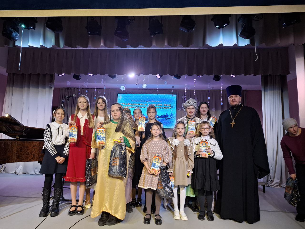 Калядны канцэрт сабраў у аўторак поўную залу дзіцячай школы мастацтваў. Яно і не дзіўна: паглядзець на выступленні сваіх дзяцей заўсёды прыходзяць родныя. А свята ладзілася сумесна ўдзельнікамі музычнай і нядзельнай школы прыходу храма Мінадоры, Мітрадоры, Німфадоры. Хоць сюжэт пастаноўкі заўсёды аднолькавы – нараджэнне Хрыста, міні-спектакль падрыхтавалі новы, як і большасць музычных нумароў. Артысты атрымалі падарункі ад благачыннага Ушацкай праваслаўнай акругі Аляксандра Таляронка, а епіскап полацкі і глыбоцкі Ігнацій перадаў іх для 25 маладых актывістаў храма – як школьнікаў, так і студэнтаў.