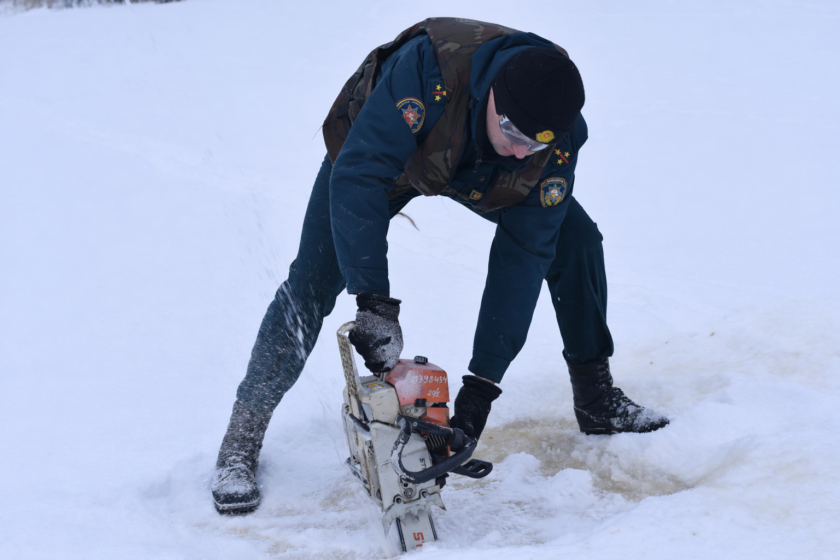 Найперш, канечне, варта ўпэўніцца, што выхад на лёд будзе бяспечным. Старшыня раённай арганізацыі выратавання на водах Мая Пацэйка робіць замер і дае дабро: таўшчыня пласту – 25 сантыметраў. Некалькі секунд – і бензапіла ва ўмелых руках супрацоўніка МНС Антона Аўдошкі выразае ў лёдзе квадратнае акно. Каб дапамога была эфектыўнай, патрэбна каля трох адтулін на гектар плошчы.