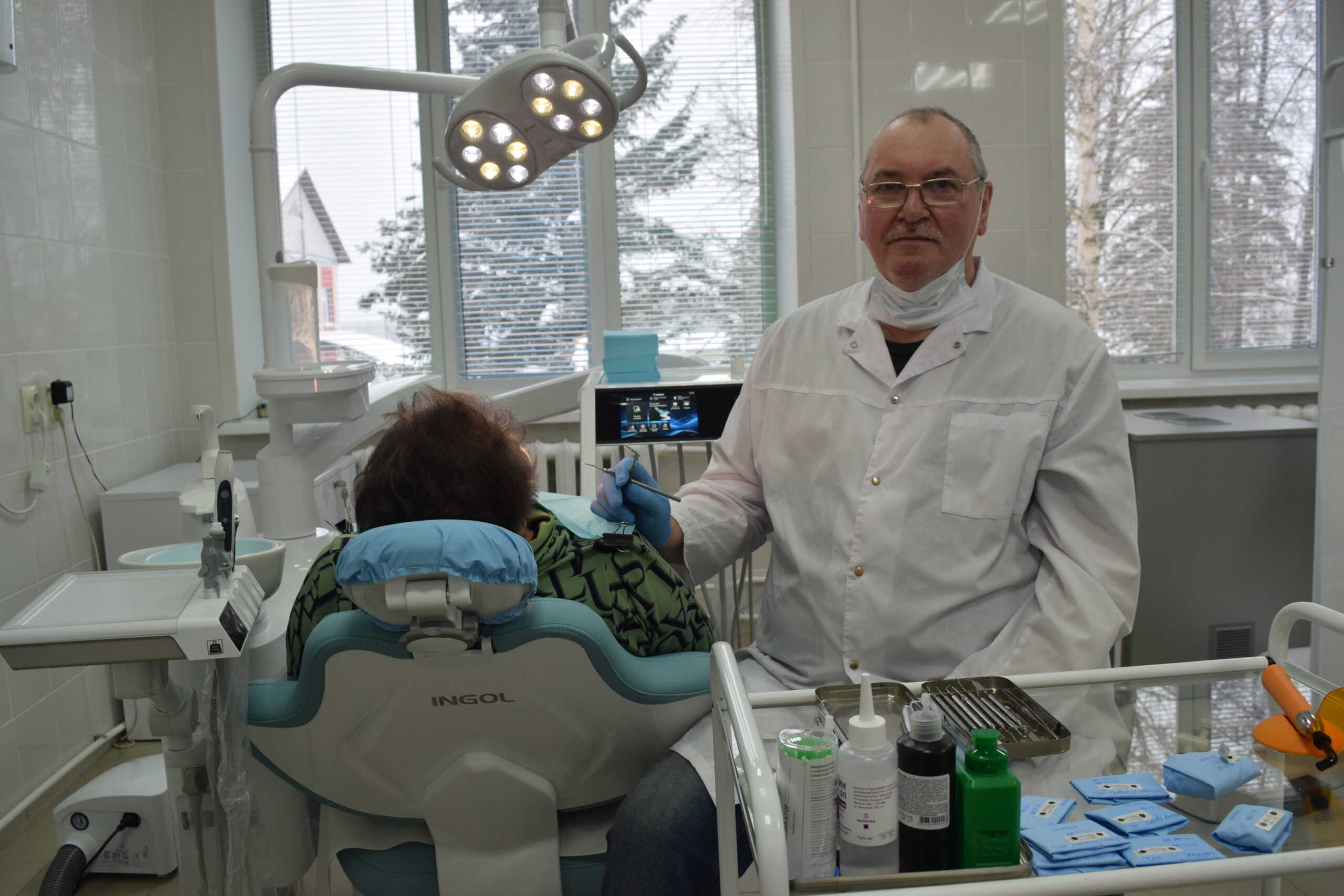 – Збоку яшчэ трывожная кнопка прадугледжана – каб пры патрэбе чалавек без слоў мог прыцягнуць нашу ўвагу, – уводзіць у курс спраў А.М.Званкоў. – Падагрэтай вадой пацыенту камфортней паласкаць рот. Спрашчаецца і працэс дэзінфекцыі інструментаў: дзякуючы сучаснай сістэме апрацоўкі, дастаткова проста заліць ва ўстаноўку раствор, націснуць кнопку і пачакаць 30 секунд.
