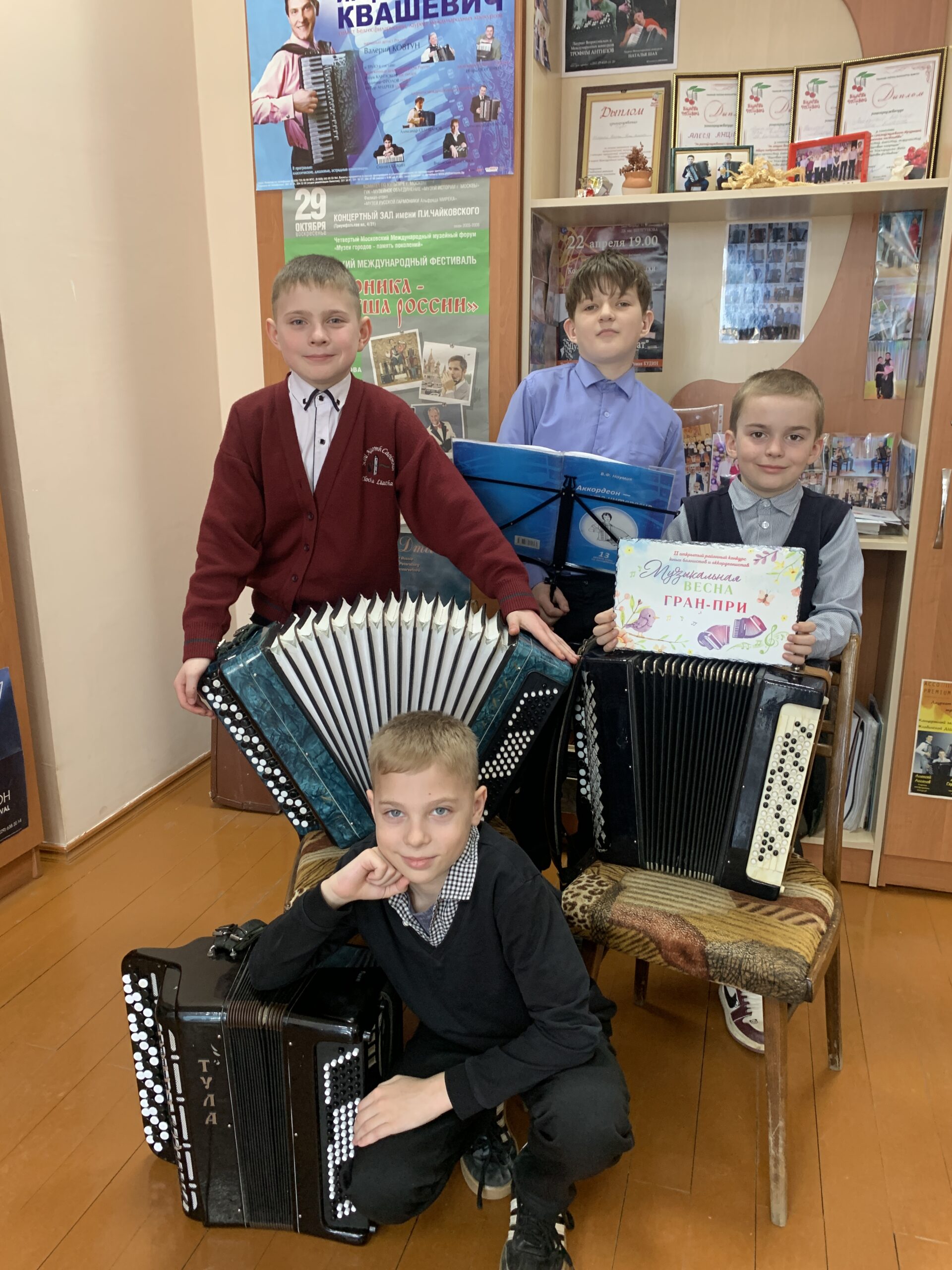 Падзяліліся хлопцы і тым, як паводзіць сябе перад выхадам на сцэну. Важнае правіла – не браць у рукі тэлефон як мінімум за паўтары гадзіны да выступлення. Ілья любіць некалькі хвілін пабыць у адзіноце, памаўчаць – гэта дазваляе настроіцца. А Вячаслаў стараецца не разглядваць людзей у зале, фіксуе погляд на якой-небудзь абстрактнай кропцы. Сярод яго любімых твораў – лірычны вальс “Развітанне”, Ільі падабаецца вясёлая п’еса “Канікулы”, каронны нумар Мікіты – ваеннае папуры, а яшчэ ён марыць сыграць сімфонію Бетховена. Хлопцы прызналіся, што ездзіць на конкурсы ім падабаецца, бо пасля выступлення іх педагогі рыхтуюць і культурную праграму: у Лепелі, напрыклад, пабывалі ў краязнаўчым музеі, а ў Паставах не толькі горад паглядзелі, а і паабедалі ў старажытным рэстаране. “А яшчэ мы там новых сяброў знайшлі: Гошу і Максіма!” – паведамілі музыканты. Калі ж мы пацікавіліся, з якога яны раёна, весела ўдакладнілі: “Мясцовыя! На гарадскім вадаёме плавалі! Гэта – лебедзі, мы іх пакармілі!”